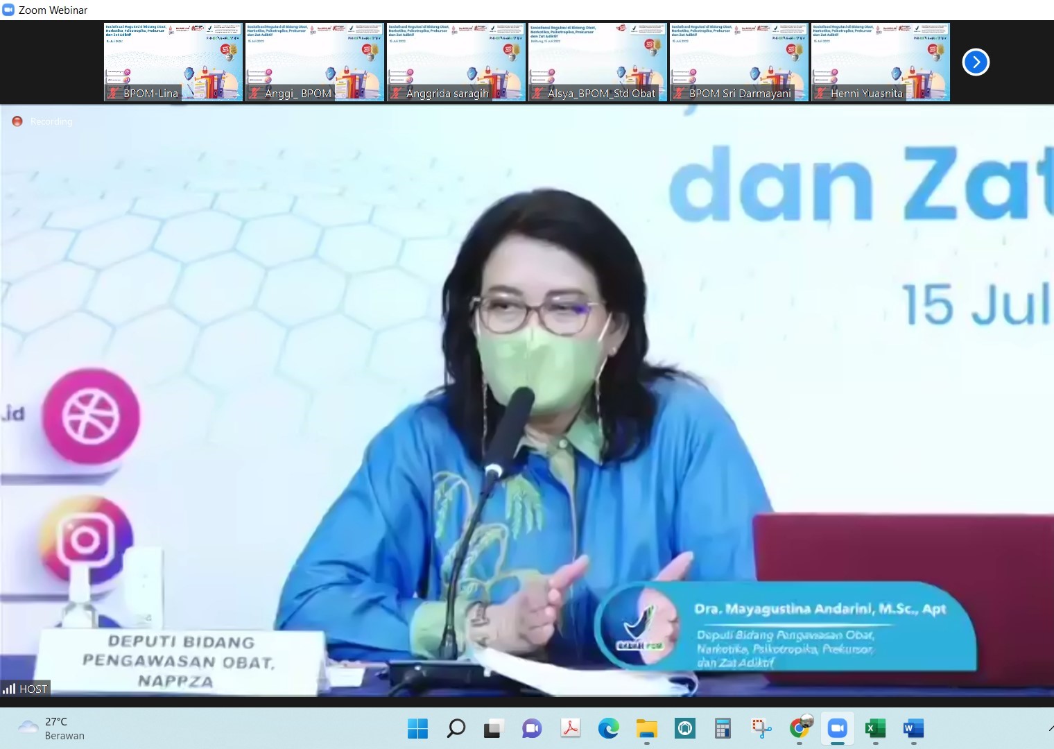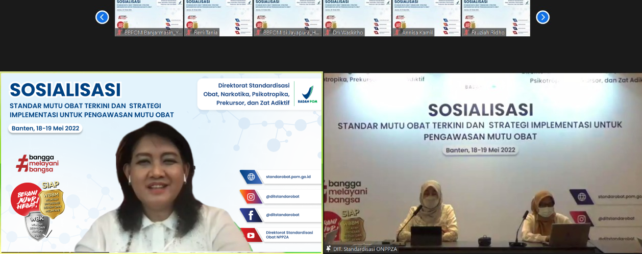 Banten - Badan POM menggelar Sosialisasi Standar Mutu Obat Terkini dan Strategi Implementasi untuk Pengawasan Obat pada Rabu dan Kamis, 18 – 19 Mei 2022 secara hybrid (luring di Banten dan daring melalui aplikasi zoom meeting). Kegiatan yang d -
